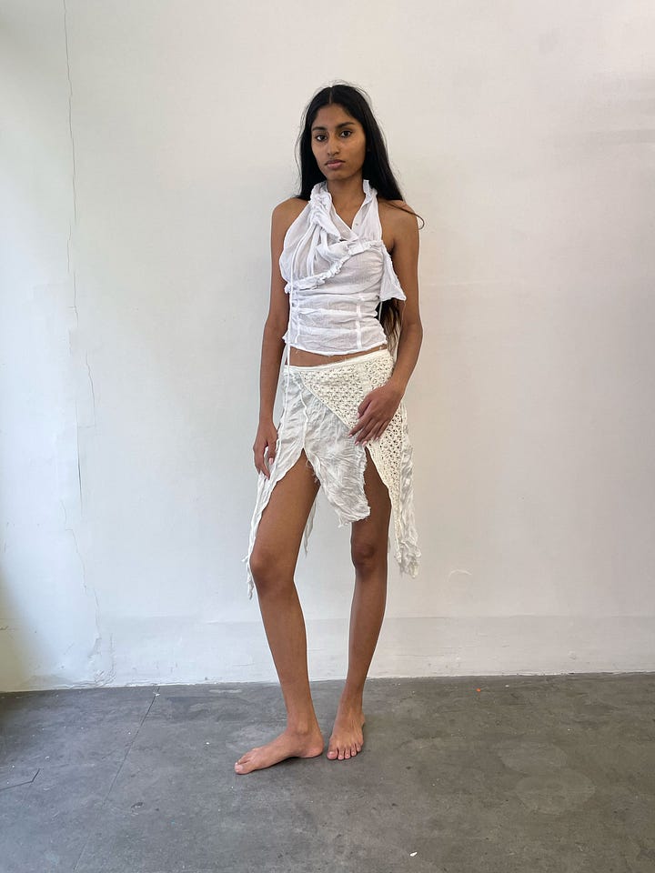 A few of the pieces from Marc Jacobs Runway have this ephemeral gauziness down pat, but my humble purse prefers the following options: The Baserange Autem bra has the ideal bramble-ribboned trim. Plein Sud knows good raunch, and this cobwebby cinnamon tube top is all coquettish dangling straps and peeking areolae. Luna del Pinal's spliced skirt is made from orange peel fibre and cotton crochet and liberates the legs to lope and gambol, whereas this linen cotton blend maxi will fold and gather in all the right places no matter how statuesque your frame.