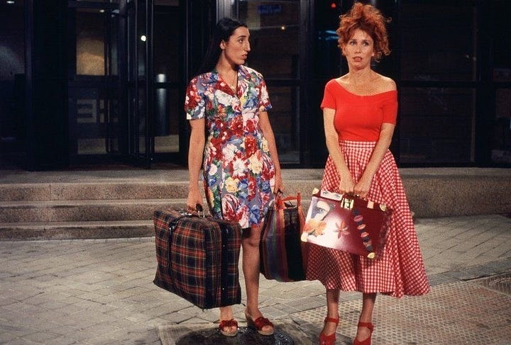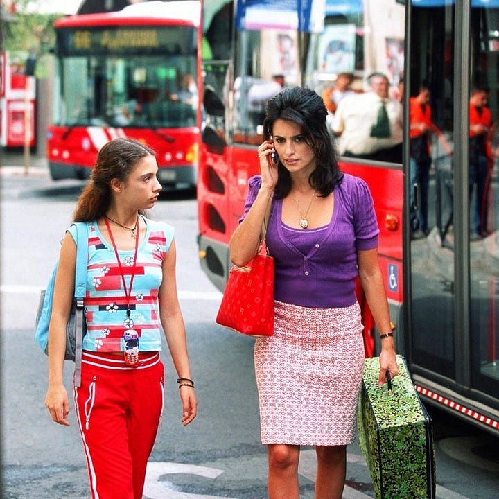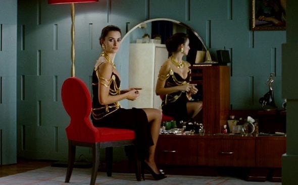 Pedro Almodóvar has a special connection to women. “I do find at least in Spanish culture, women to be more vivacious, more direct, more expressive, with a lot less of a sense of being fearful of making a fool of themselves.” His admiration shows through in his incandescent female characters, portrayed by actresses like Penelope Cruz, Rossy de Palma and Verónica Forqué, but also in the care with which he dresses them. It’s rare to see a director maintain such clear dialogue with their costume designer, and the work of Jose Maria de Cossío and more recently Sonia Grande, shows time and dedication from both parties. Pop art color palettes! Tomato red! Moka pot earrings! Collaborations with Gaultier and Versace! Almodovar’s movies are an IV drip of high (and low!) fashion. In Kika (1993), Victoria Abril delivers a monologue in a Gaultier original referencing Madonna’s cone bra: a high-neck velvet and sequin gown with two holes slashed in the front, exposing large (plastic) breasts. Penelope Cruz plays a leading lady in Broken Embraces (2009), donning both archival Chanel and Alaia as the film switches time periods. Tilda Swinton’s character in The Human Voice (2020) wears a turquoise Balenciaga suit to buy an axe. This is how passionate women dress!