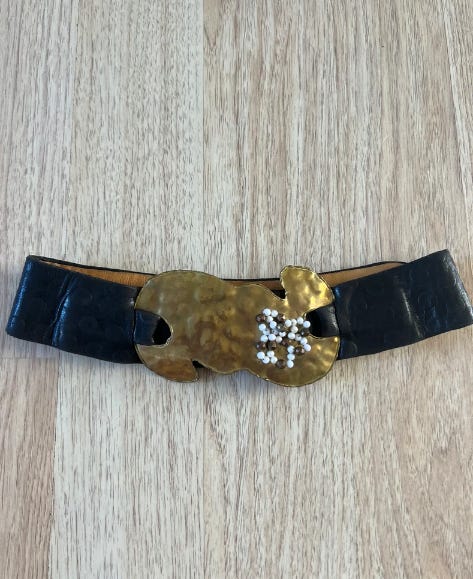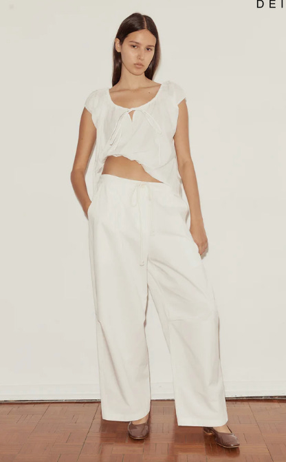 However, there is one look that captivates me most of all, glimpsed for but a moment. Tadzio enters the dining room of the Hotel des Bains wearing simple black trousers, a belt slung low and loose around the untucked hem of a white tunic. There is a serenity to the plainness. Here is how I would reproduce it: relaxed wide leg cotton pants (these ones are from Deiji Studio), a poetically proportioned blouse (this vintage Costume National number), and a belt with just enough (but not too much!) pizzazz (this vintage Stephanie Krishner is the ticket).