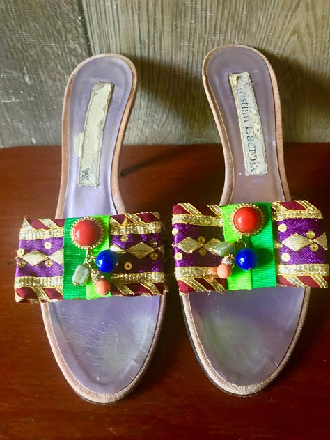To conjure Diana, we want the spiritual equivalent of bare feet… but in a shoe. Every newsletter worth its salt recommended these Ancient Greek jellies, but have you encountered the Monfaradi Mare Beach Ballerina? A formidable option to keep you feeling quite literally grounded, but also useful for tackling a rocky beach. The barefoot sensation originates with the Vibram Five Finger, which may make you squeamish, but I am seriously considering a pair in this mesh ballerina style. They are in stock on the website in burgundy. Alaia, eat your heart out. If you are the type to run in heels, these straw Giuseppe Zanotti sandals serve pastoral wantonness. Gyouree Kim Pixie heels are another, more animalic possibility.